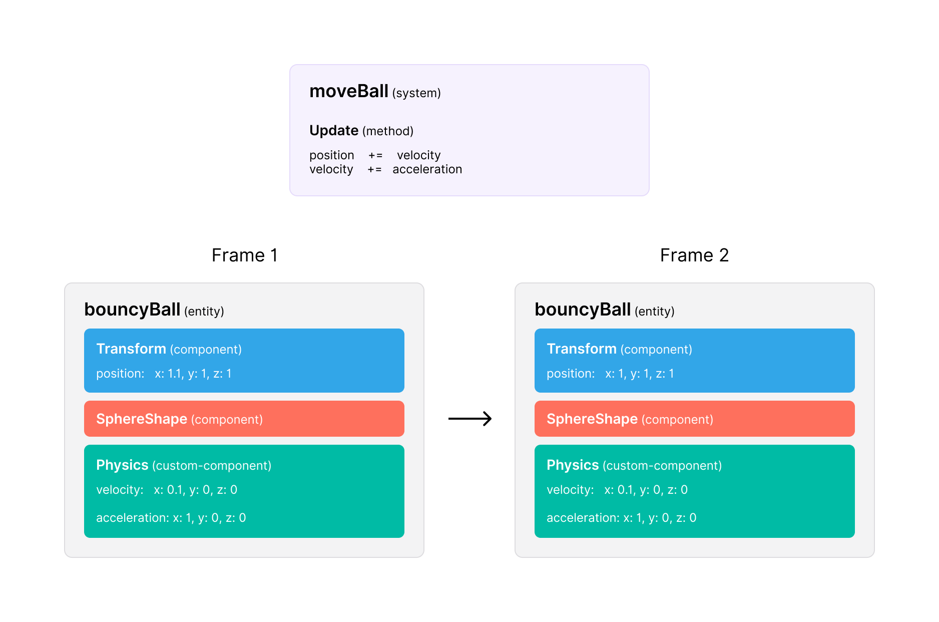 In the example above, the system MoveSystem executes the update() function of each frame of the game loop, changing position of every entity in the scene.